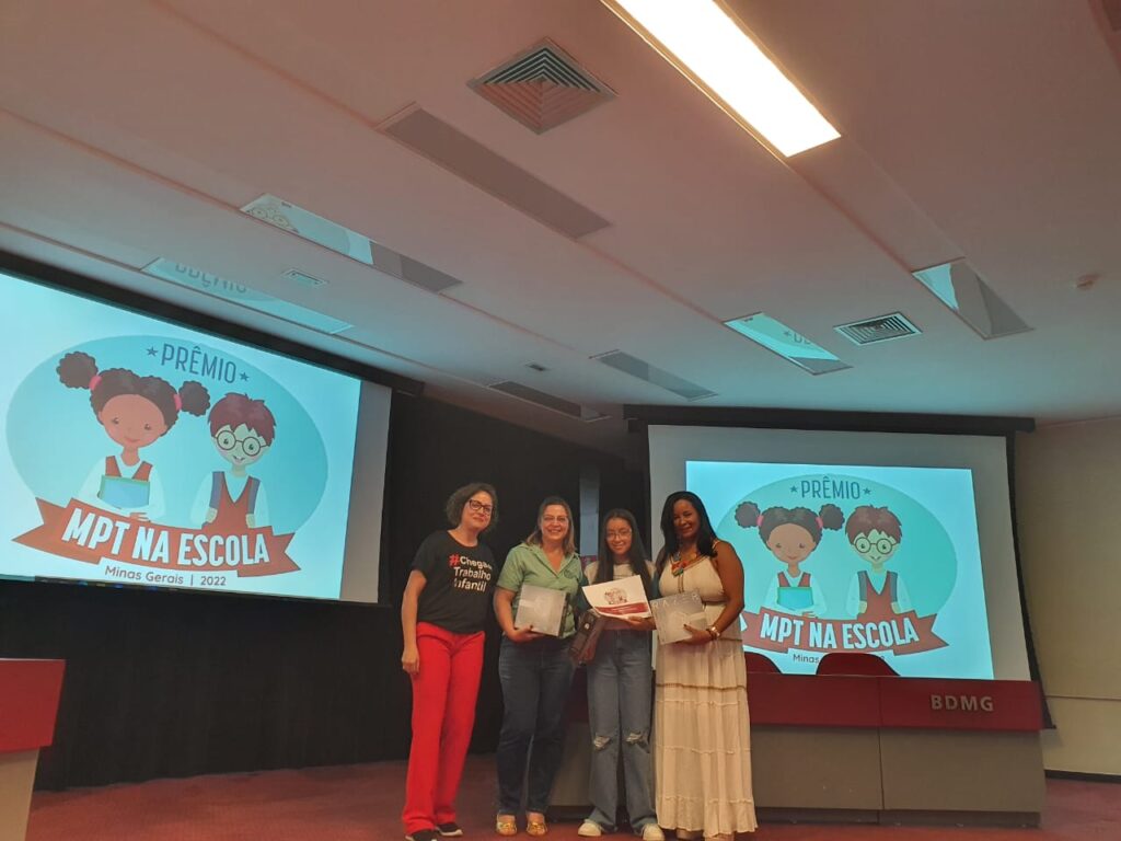 Foi realizada no último mês, no auditório do Banco de Desenvolvimento de Minas Gerais — BDMG, em Belo Horizonte, a entrega dos prêmios relacionados ao projeto Resgate a Infância, promovido pelo Ministério Público do Trabalho — MPT. Na ocasião, 4 alunos da Rede Municipal de Ensino e seus professores foram contemplados na etapa estadual do concurso.