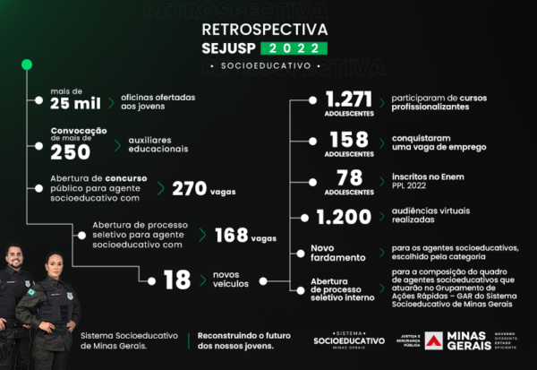 Em 2022, mais de 250 novos servidores foram convocados e tomaram posse no concurso para Assistente Executivo de Defesa Social – Auxiliar Educacional. O grupo foi distribuído nos centros socioeducativos de Minas Gerais, expandindo o número desses profissionais no estado. O principal objetivo do certame foi potencializar as atividades culturais, sociais e esportivas, conforme preconizam o Sistema Nacional de Atendimento Socioeducativo (Sinase) e o Estatuto da Criança e do Adolescente (ECA), visando interromper a trajetória infracional dos adolescentes em medida de internação ou semiliberdade.