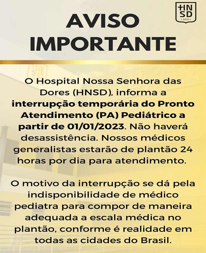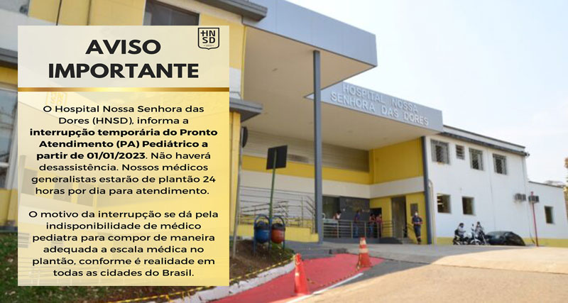 Na manhã desta quarta-feira 28 de dezembro, o Hospital Nossa Senhora das Dores (HNSD), em Itabira, emitiu um comunicado informando sobre a interrupção temporária do Pronto Atendimento (PA) Pediátrico.