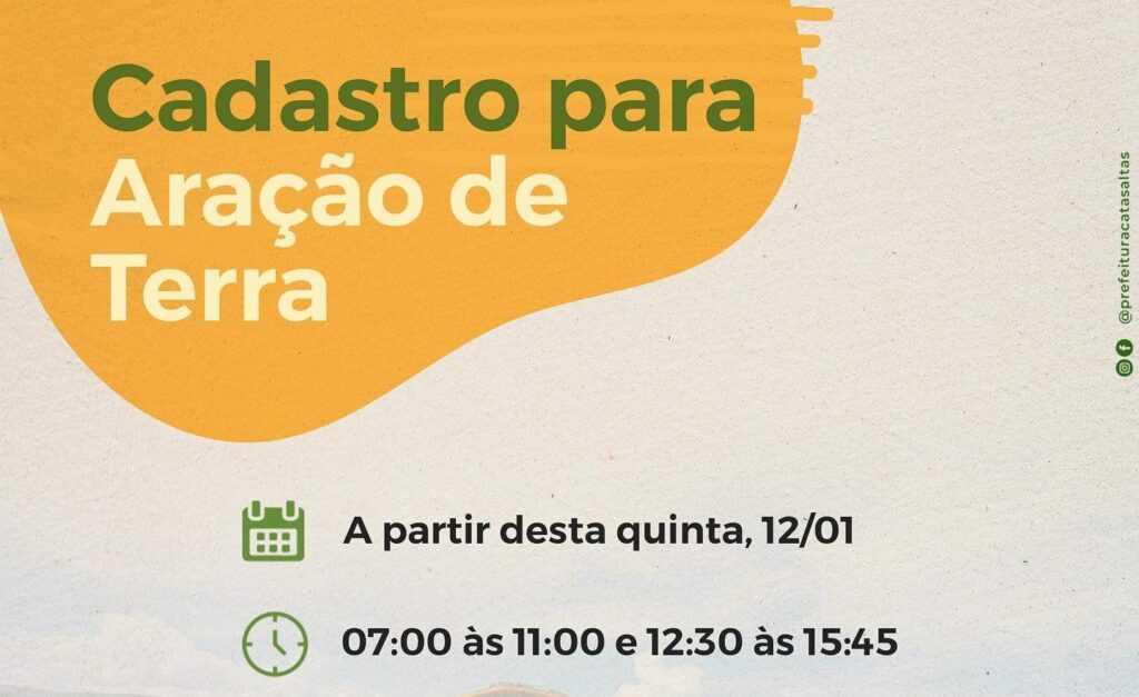 Prefeitura de Catas Altas abre inscrição para aração de terra A Prefeitura Municipal através da Secretaria de Agricultura e Meio Ambiente, iniciará a partir desta quarta-feira, 11/01, o cadastro para os proprietários interessados em realizar a aração em suas propriedades rurais. Os interessados na realização desse serviço devem se inscrever na Secretaria de Agricultura e […]