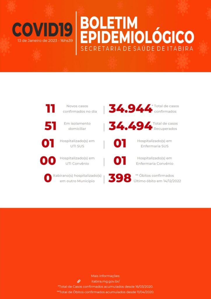 Boletim Covid-19 no dia 13/01/2023 Sem registro de óbitos até o fechamento do boletim. Último óbito confirmado em 14/12/2022. *CASOS CONFIRMADOS:* *•UTI Convênio:* Itabira: 0 *•UTI SUS:* Itabira: 0 Outros municípios: 1 São Gonçalo *•Enfermaria Convênio:* Itabira: 1 paciente *•Enfermaria SUS:* Itabira: 0 pacientes; Outros municípios: 1 Morro do Pilar