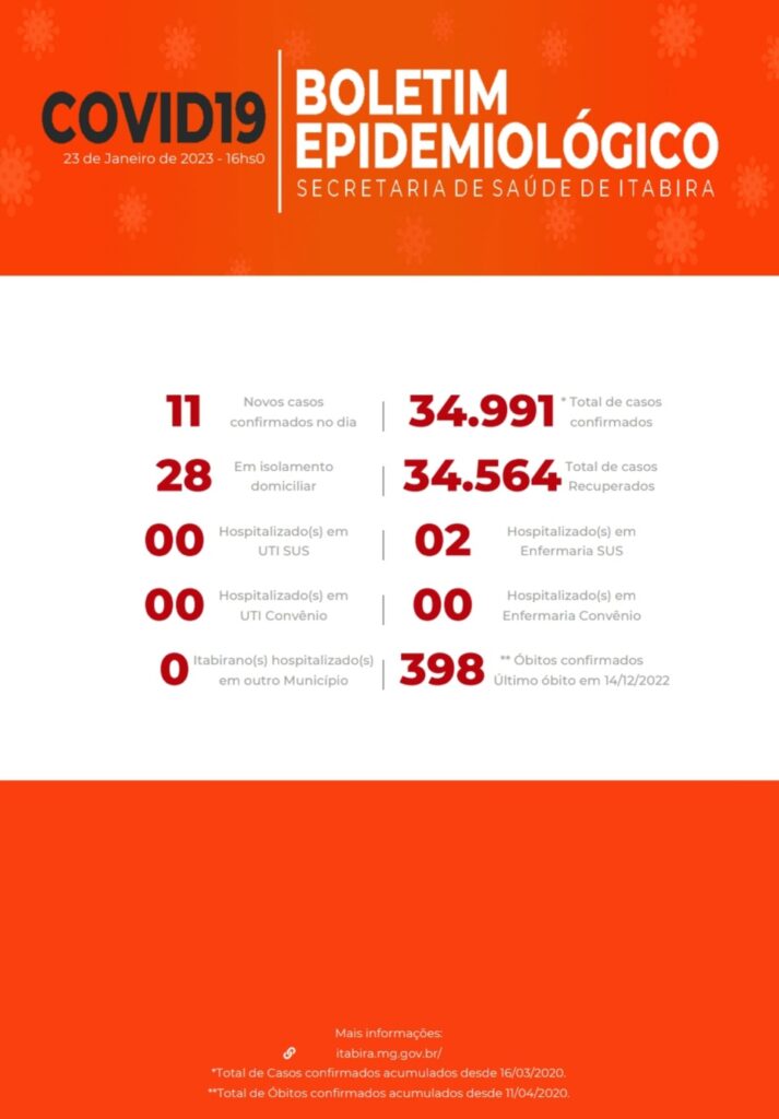 Boletim Covid de hoje (23/01/2023) Sem registro de óbitos até o fechamento do boletim. Último óbito confirmado em 14/12/2022. . CASOS CONFIRMADOS: •UTI Convênio: Itabira: 0 •UTI SUS: Itabira: 0 Outros municípios: 0 . •Enfermaria Convênio: Itabira: 0 •Enfermaria SUS: Itabira: 1 Outros municípios: 1 São Gonçalo