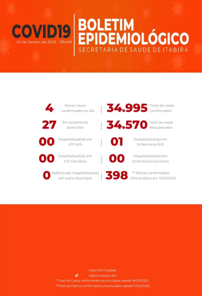 Boletim Covid de hoje (24/01/2023) Sem registro de óbitos até o fechamento do boletim. Último óbito confirmado em 14/12/2022. . CASOS CONFIRMADOS: •UTI Convênio: Itabira: 0 •UTI SUS: Itabira: 0 Outros municípios: 0 . •Enfermaria Convênio: Itabira: 0 •Enfermaria SUS: Itabira: 0 Outros municípios: 1 São Gonçalo