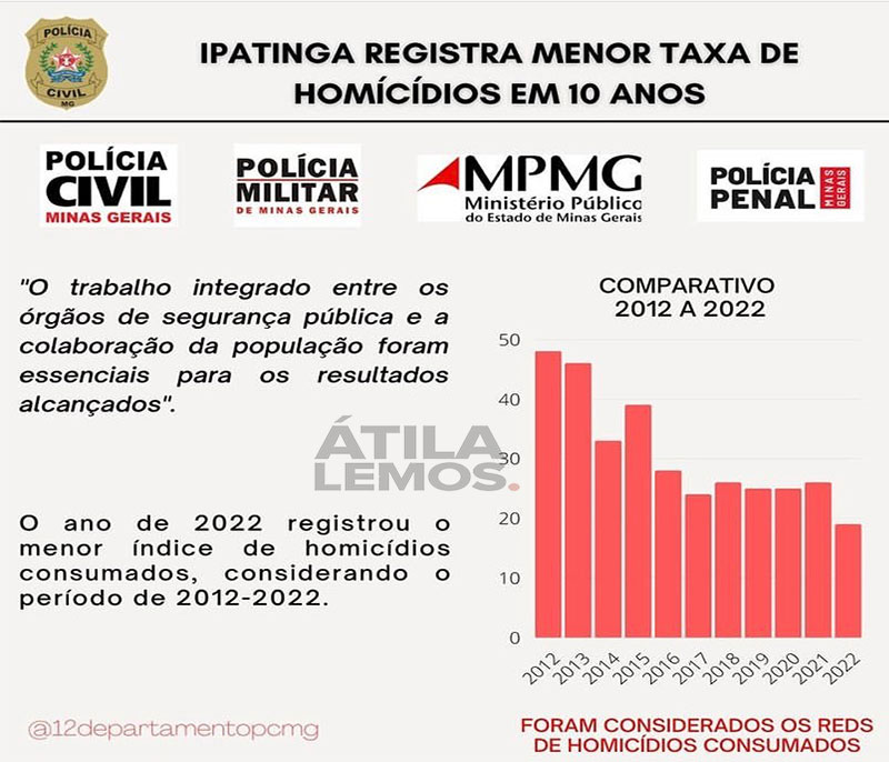 De acordo com o Delegado Geral de Polícia, Gilmaro Alves Ferreira, entre os índices que mais chamaram a atenção, está o índice de homicídios consumados em Ipatinga. De acordo com os dados, Ipatinga obteve a menor taxa de homicídios dos últimos 10 anos.