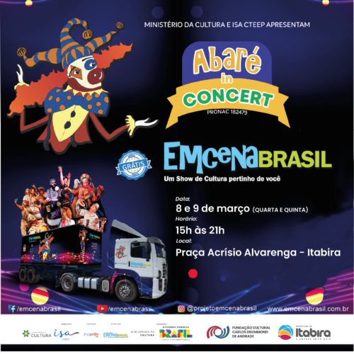 O teatro móvel do Abaré In Concert-Emcena Brasil chega à Itabira e no distrito de Ipoema, com entrada gratuita. Realizado pela Companhia Abareteatro, por meio do Ministério da Cultura, Secretaria Especial da Cultura e com patrocínio da ISA CTEEP, maior transmissora privada de energia elétrica do País.