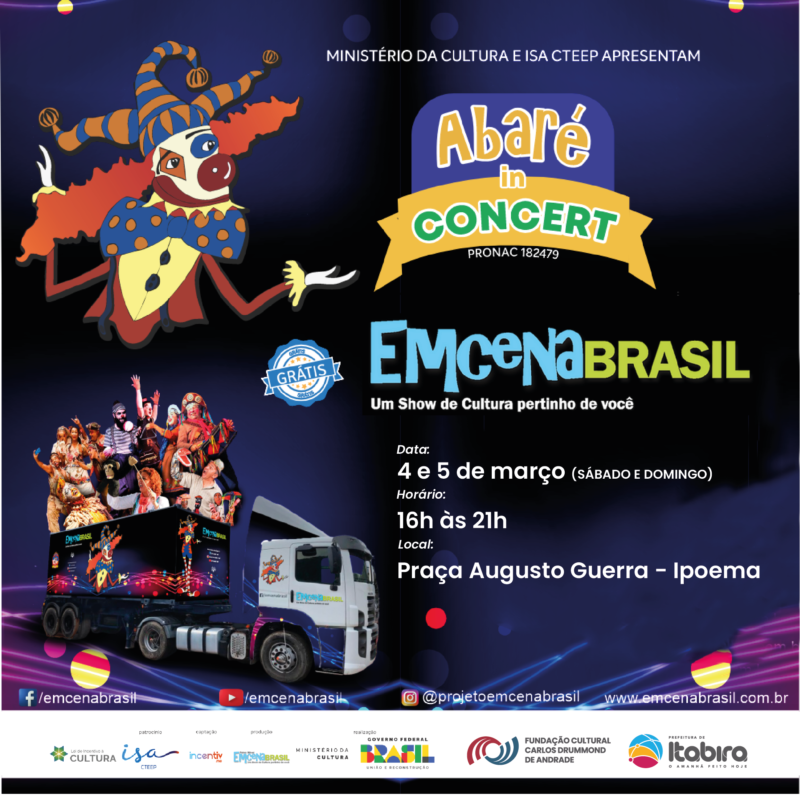 O teatro móvel do Abaré In Concert-Emcena Brasil chega à Itabira e no distrito de Ipoema, com entrada gratuita. Realizado pela Companhia Abareteatro, por meio do Ministério da Cultura, Secretaria Especial da Cultura e com patrocínio da ISA CTEEP, maior transmissora privada de energia elétrica do País.