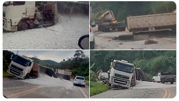 A Policia Rodoviária Federal registrou mais uma acidente na rodovia federal BR-262. Na região de Realeza, ocorreu uma colisão entre carretas e uma delas tombou derramando o material na pista de rolamento, e a outra ficando atravessada. Veja também: Carreta faz “L” e sai da pista na BR381 Vídeo: PM prende suspeito de estrangular mulher […]