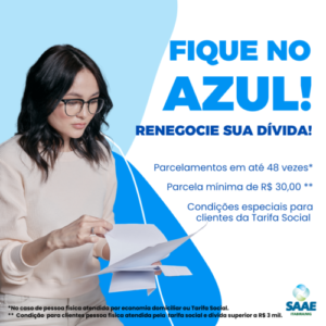 Teve início nesta semana os critérios e condições referentes aos parcelamentos de dívidas para os clientes do Serviço Autônomo de Água e Esgoto (Saae) de Itabira. A partir de agora, os débitos atrasados poderão ser pagos em até 48 vezes e com parcela mínima de R$ 30 (condições exclusivas para clientes beneficiados com a Tarifa Social).