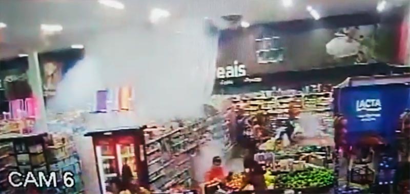 Câmeras de segurança do supermercado registraram o momento da explosão, que teve início na lateral de uma gôndola e atingiu o teto do supermercado, derrubando o forro.