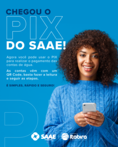 O Serviço Autônomo de Água e Esgoto (Saae) de Itabira disponibiliza, desde a última sexta-feira (14), novas formas de pagamento das contas de água para facilitar a quitação das faturas. Agora, além de poder pagar as contas nas redes credenciadas, os clientes também poderão quitar os débitos usando o PIX.“Oferecemos mais essa opção de pagamento aos nossos clientes, para que possam escolher o meio que mais se encaixe em sua rotina. O PIX é uma forma de pagamento moderna e que traz ainda mais comodidade, segurança e agilidade. É mais uma ação do Saae para melhor atender a população itabira”, disse a presidente Karina Rocha Lobo.