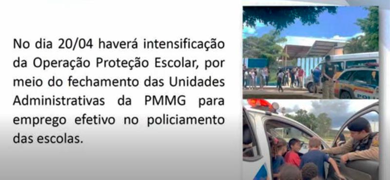 “Não queríamos destacar esta data mas, para buscarmos uma amenização desse estado emocional da população mineira, no dia 20, 100% da Polícia Militar estará trabalhando na segurança das escolas. Vamos parar todo trabalho administrativo para que este dia, em conjunto com a secretaria de educação, seja extremamente tranquilo e que marque um momento diferente nas escolas estaduais e municipais de nosso estado”.
