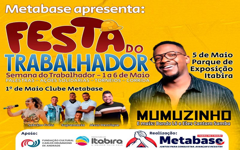 Neste ano, a semana do trabalhador retorna com muito mais interatividade e abrangência, visando maior envolvimento da comunidade, valorização dos artistas itabiranos, a solidariedade e o mais importante: o reforço da luta e defesa dos trabalhadores, aposentados e pensionistas. A semana do trabalhador é idealizada e realizada pelo Sindicato Metabase e conta com parcerias tais como a Prefeitura Municipal de Itabira, Fundação Cultural Carlos Drumond de Andrade, Central Sindical CUT, Unifuncesi , fornecedores , empresas representadas e demais parceiros.