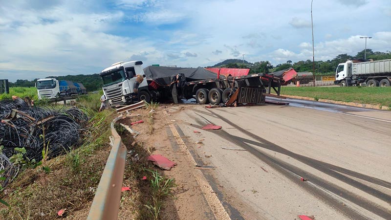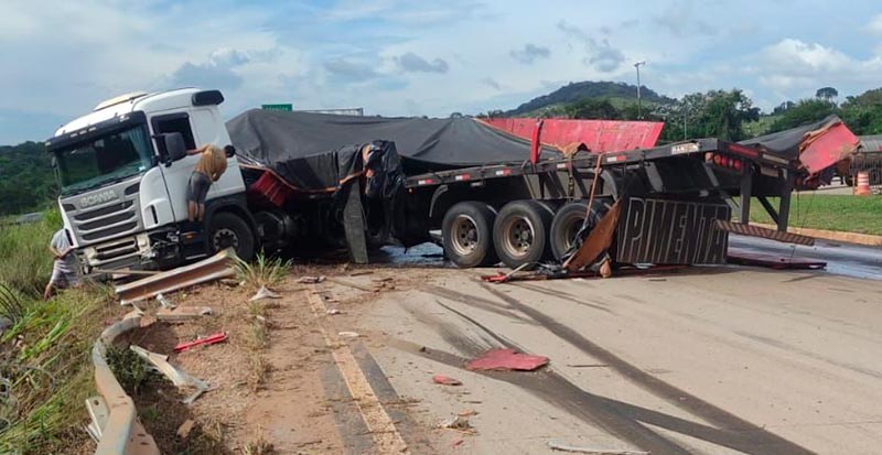 A carreta “ficou em L” interditando parcialmente a pista no sentido BH/Vitória. Parte da carga ficou no canteiro central.