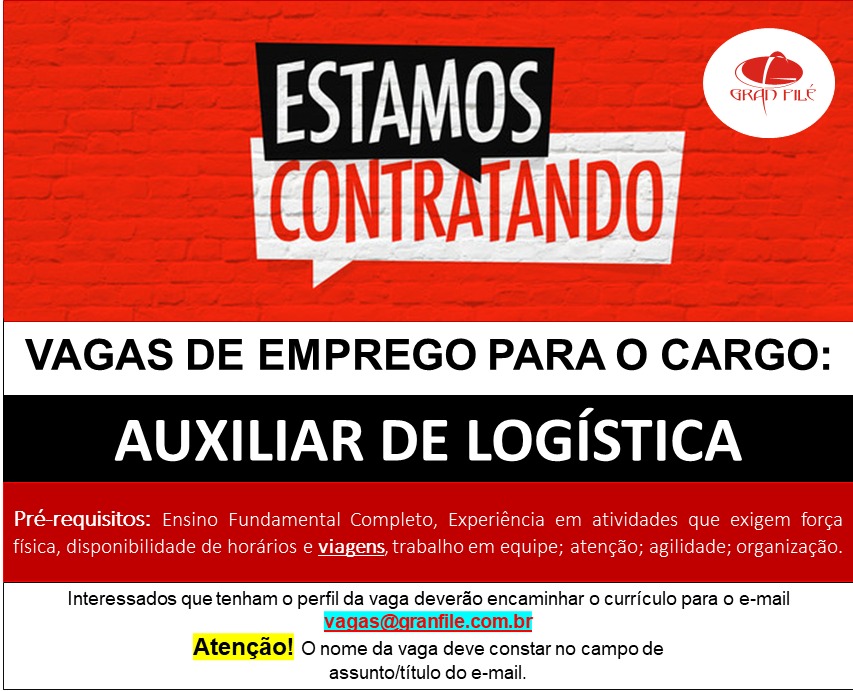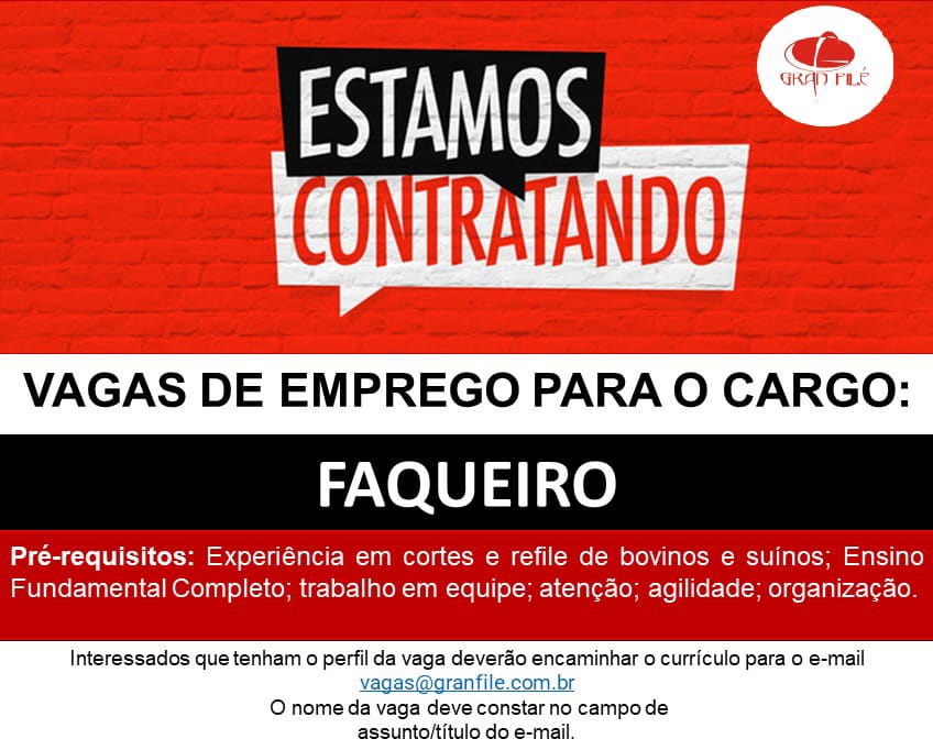 Os interessados que tenham o perfil indicado, deverão enviar o currículo à empresa Gran Filé para o e-mail: vagas@granfile.com.br com o nome da vaga no assunto do e-mail .