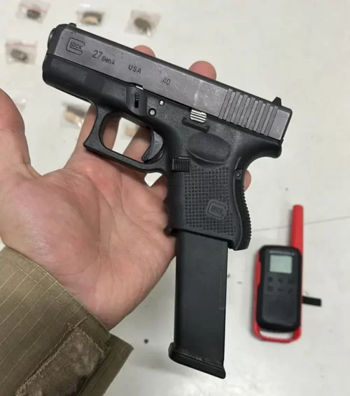 Com o autor foram apreendidos uma pistola .40 Glock com carregador alongado, além de uma mochila que continha um kit Roni (peças acopladas a arma possibilitam disparo em modo rajada e mira a laser), 28 buchas de maconha, nove munições do mesmo calibre da arma, 22 cartuchos, um rádio comunicador e caderno com anotações do tráfico.