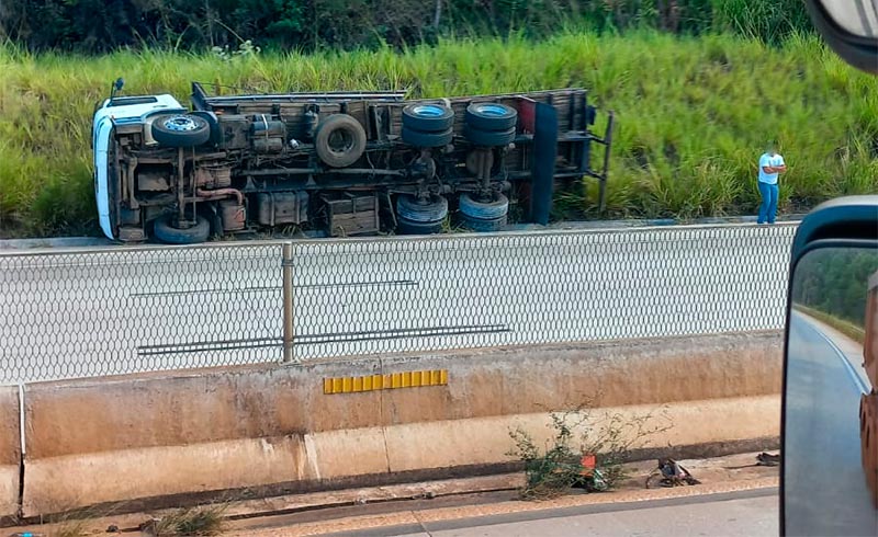 Um caminhão tombou na manhã desta quinta-feira (01/06) na rodovia federal BR381, na região de Nova União, após atingir a canaleta de escoamento de água pluvial.