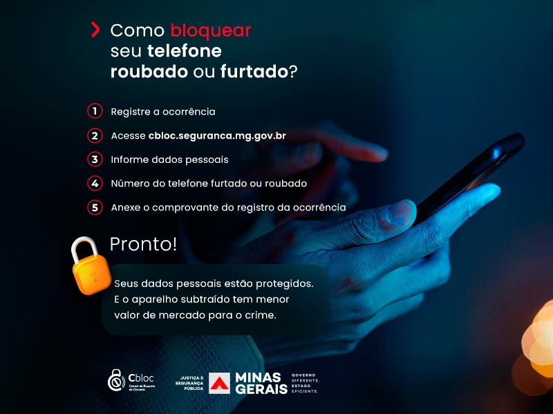 A Central de Bloqueio de Celulares de Minas Gerais (Cbloc) funciona de forma online e possibilita a inutilização do aparelho roubado ou furtado de forma imediata diminuindo seu valor de mercado. Além dos ganhos para a Segurança Pública, o cidadão que requer esse bloqueio por meio do endereço www.cbloc.mg.gov.br, protege seus dados pessoais, já que diminui a chance de acesso a informações importantes como conversas em aplicativos de mensagens instantâneas, fotos ou caminhos diários salvos em aplicativos de GPS, para citar alguns exemplos.