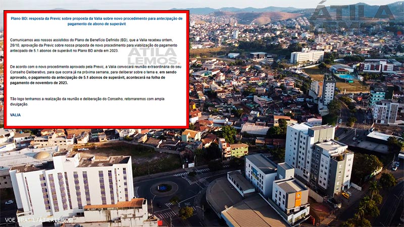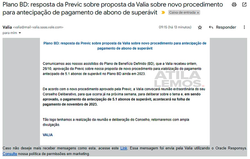 “Comunicamos aos nossos assistidos do Plano de Benefício Definido (BD), que a Valia recebeu ontem, 26/10, aprovação da Previc sobre nossa proposta de novo procedimento para viabilização do pagamento antecipado de 5.1 abonos de superávit no Plano BD ainda em 2023. De acordo com o novo procedimento aprovado pela Previc, a Valia convocará reunião extraordinária do seu Conselho Deliberativo, para que ocorra já na próxima semana, para deliberar sobre o tema e, em sendo aprovado, o pagamento da antecipação de 5.1 abonos de superávit, acontecerá na folha de pagamento de novembro de 2023. Tão logo tenhamos a realização da reunião e deliberação do Conselho, retornaremos com ampla divulgação”.