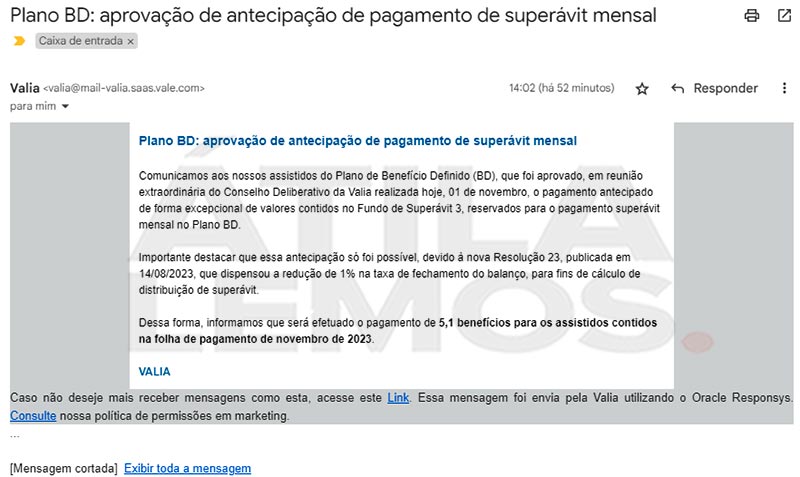 Com exclusividade novamente, nossa reportagem teve acesso ao e-mail e o resultado da votação e aprovação do Plano BD, assim sendo aprovado a antecipação de pagamento de superávit mensal.