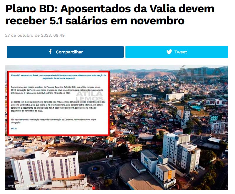 “Comunicamos aos nossos assistidos do Plano de Benefício Definido (BD), que foi aprovado, em reunião extraordinária do Conselho Deliberativo da Valia realizada hoje, 01 de novembro, o pagamento antecipado de forma excepcional de valores contidos no Fundo de Superávit 3, reservados para o pagamento superávit mensal no Plano BD.