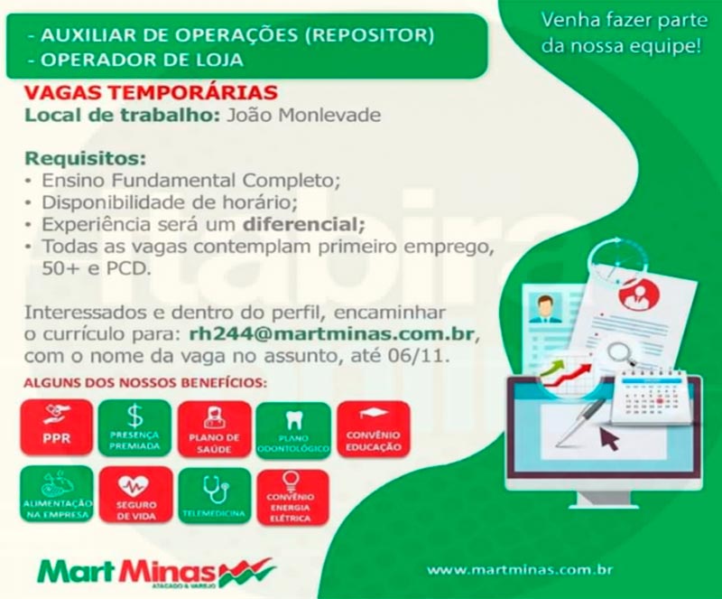 Os interessados devem encaminhar currículo para: rh244@martminas.com.br