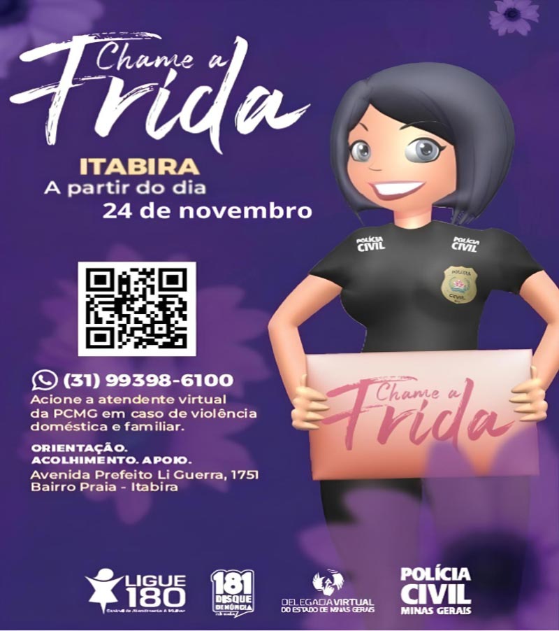 O Chame a Frida é uma assistente virtual criada para acolher, orientar e socorrer vítimas em situações de violência doméstica e familiar. O contato é realizado por meio do aplicativo de mensagens WhatsApp, que em Itabira atenderá pelo número (31) 99398-6100.