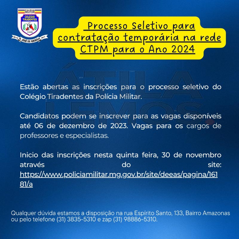 Estão abertas as inscrições para o processo seletivo do Colégio Tiradentes da Polícia Militar. Candidatos podem se inscrever para as vagas disponíveis até 06 de dezembro de 2023.Vagas para os cargos de professores e especialistas.