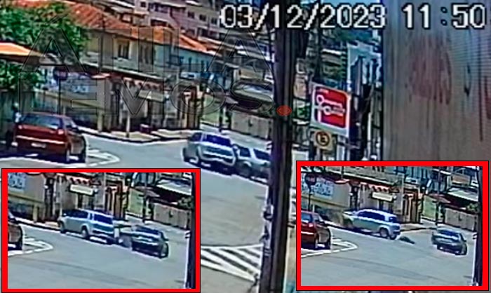 O acidente foi neste domingo, 3/12/2023, por volta das 11h50. Uma câmera de segurança flagrou a colisão.
