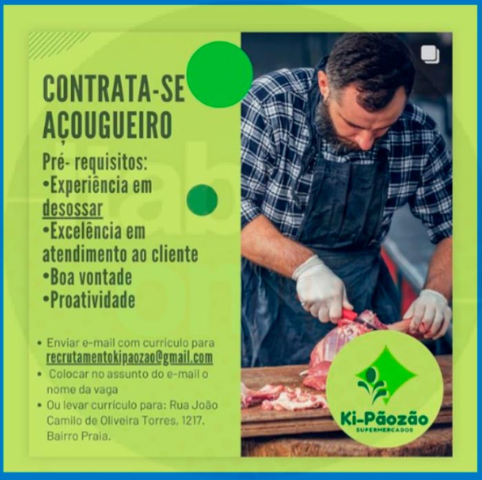 As pessoas interessadas na divulgação, deverão encaminhar o currículo para e-mail descrito na vaga. E-mail: recrutamentokipaozao@gmail.com