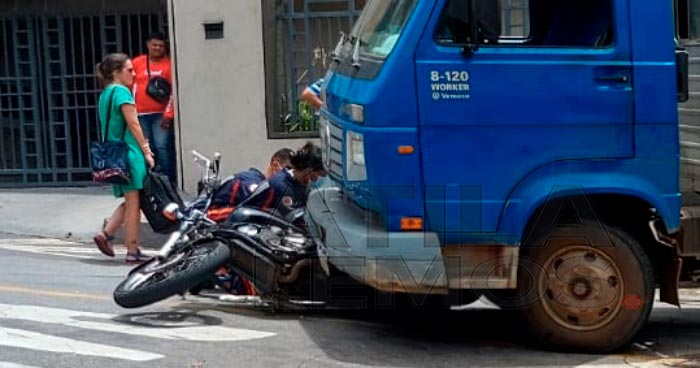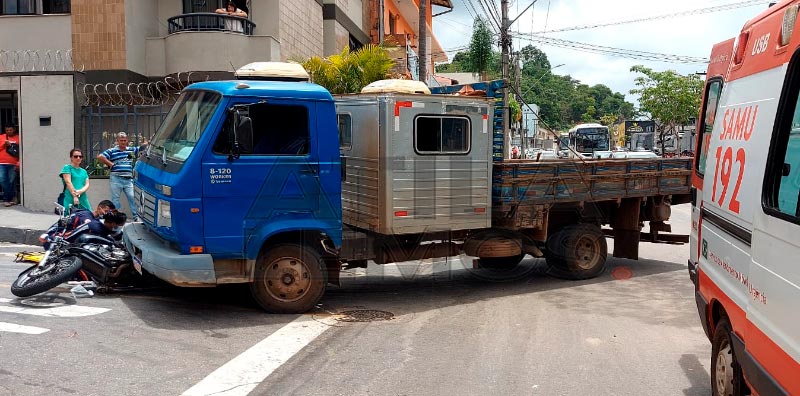 Um homem acabou ficando ferido e a perna presa após a colisão envolvendo um caminhão e uma moto.