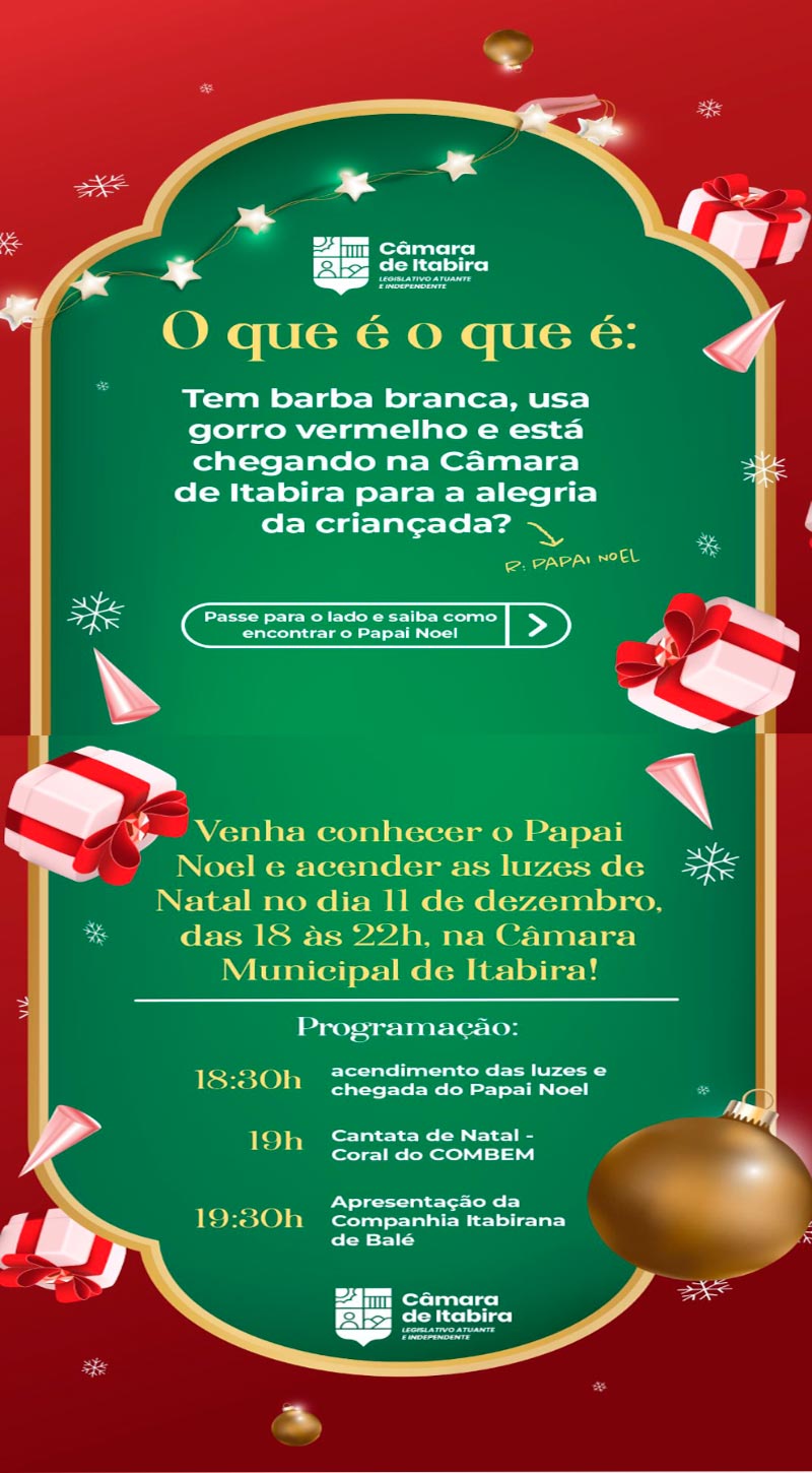 O Papai Noel está chegando aqui na Câmara e você é o nosso convidado! Venha e traga as crianças para conhecer o bom velhinho, curtir as luzes de Natal e prestigiar as apresentações artísticas. Esperamos você e a sua família!