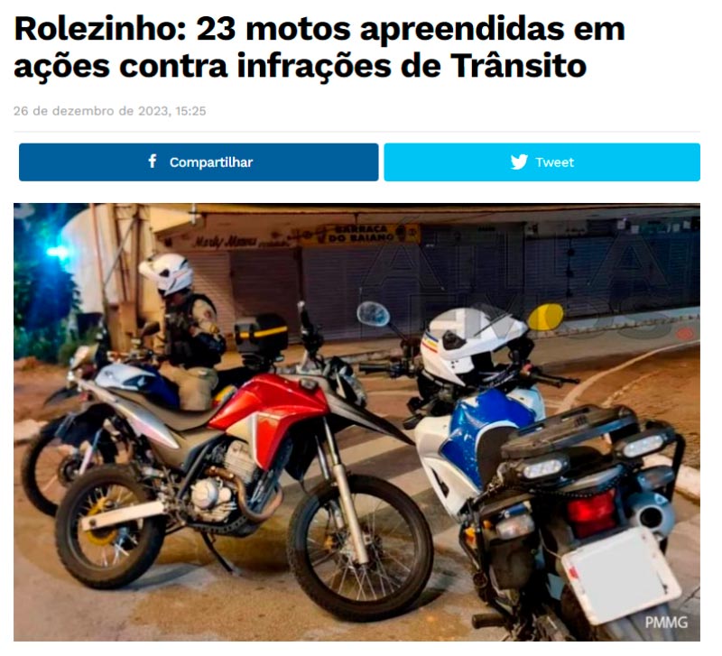 No período de 23 a 25 de dezembro a Polícia Militar de Minas Gerais realizou diversas Operações Policiais com o intuito de reprimir a prática de crimes de trânsito e direção perigosa por parte de condutores de motocicletas, denominado pelos participantes como “Rolezinho do Grau”.