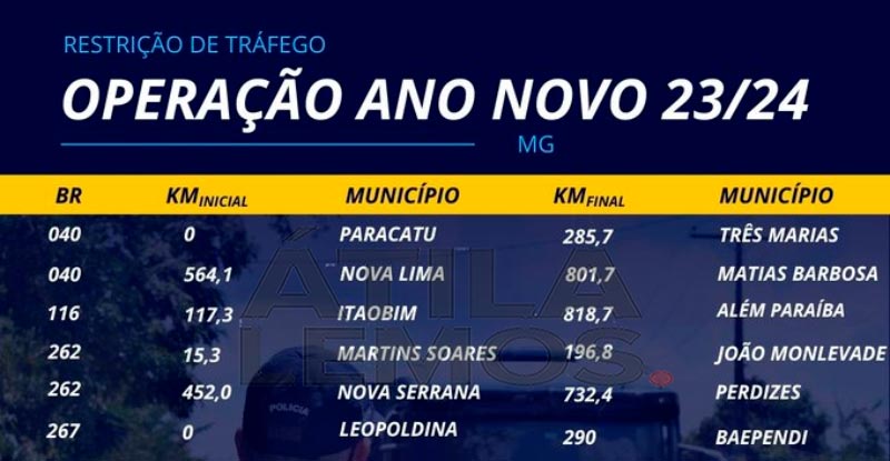 A Polícia Rodoviária Federal informa sobre as rodovia e/ou trechos interditado e com área em risco, como por exemplo na região de Antônio Dias sentido a Ipatinga/MG. Outro trecho também sinalizado fica na BR262, região de João Monlevade sentido a Belo Horizonte, onde tem erosão na pista. Caso vá viajar nesta virada de final de […]