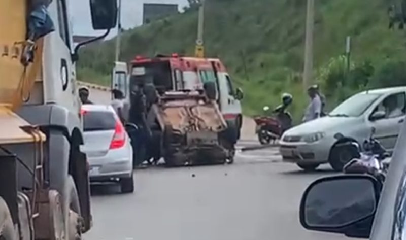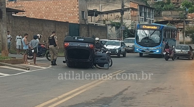Um carro capotou após atingir uma placa de outdoor na descia do bairro Monsenhor José Lopes em Itabira.