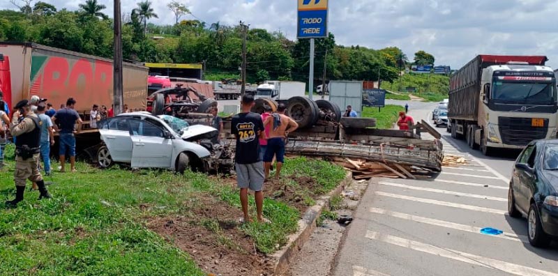 O acidente foi em frente ao posto Fumaça, no local ocorreu a colisão envolvendo um caminhão carregado com madeira e outros dois veículos de passeio.