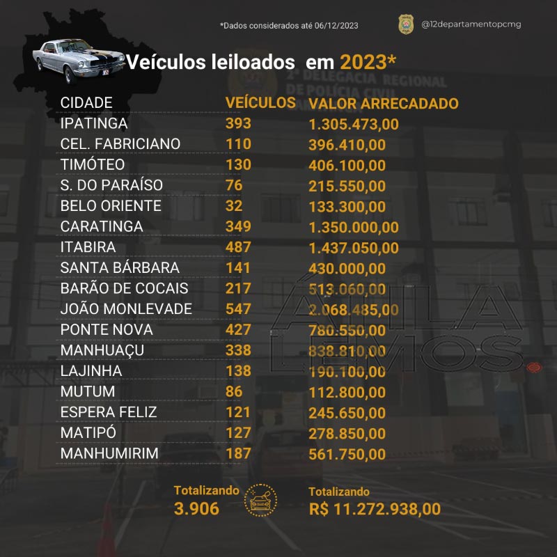 Conforme divulgado pelo 12º Departamento de Polícia de Ipatinga, que presta serviços à sociedade, foram apresentados os dados referentes ao quantitativo de veículos leiloados em 2023, assim como os valores arrecadados.
