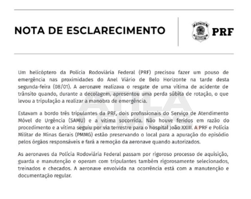 A PRF (Polícia Rodoviária Federal) emitiu uma NOTA de esclarecimento sobre a queda de uma de suas aeronave em Belo Horizonte, durante ao atendimento a uma vítima de acidente automobilístico.