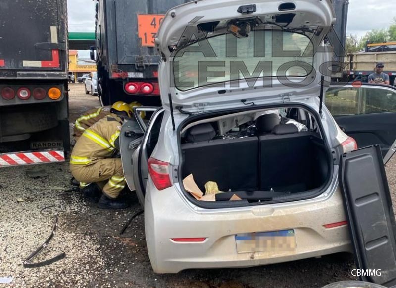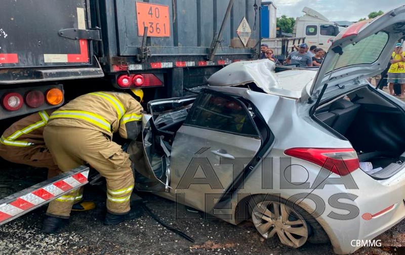 Os Militares do Corpo de Bombeiros foram empenhados em um acidente envolvendo a colisão frontal de um veículo de passeio contra a traseira de uma carreta, na BR 116, zona urbana de Divisa Alegre.