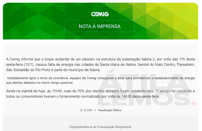 “A Cemig informa que o toque acidental de um pássaro na estrutura da subestação Itabira 2, por volta das 11h desta sexta-feira (12/1), causou falta de energia nas cidades de Santa Maria de Itabira, Itambé do Mato Dentro, Passabém, São Sebastião do Rio Preto e parte do município de Itabira.