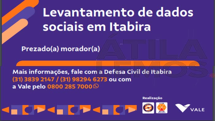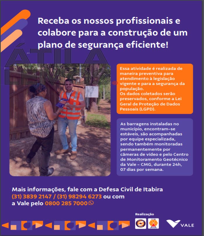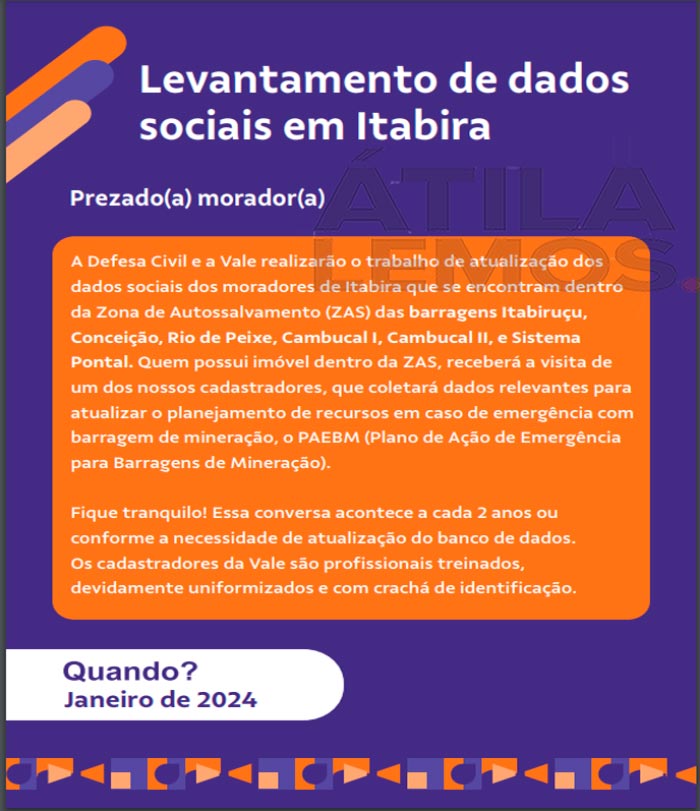 A Defesa Civil de Itabira e a Vale devem fazer o recadastramento nas áreas de riscos próximas às barragens classificadas como ZAS (Zona de Auto Salvamento).