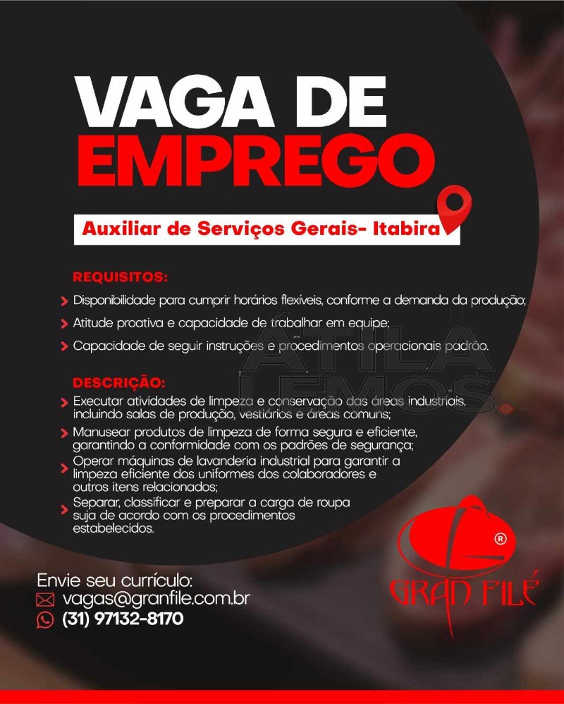 Os interessados que tenham perfil dessa vaga, deverão enviar o currículo à empresa Gran Filé no e-mail: vagas@granfile.com.br com o nome da vaga no assunto.