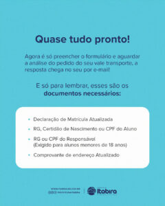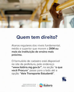 Já estão abertas as inscrições para o recebimento do Meio Passe Estudantil, da Secretaria Municipal de Educação (SME). Os interessados têm até o dia 29 de fevereiro para fazer um novo cadastro ou renovação do benefício. Todos os estudantes da cidade têm direito ao meio passe, concedido por meio da Prefeitura de Itabira. Alunos da rede municipal, estadual, cursos técnicos e superiores, maiores de 12 anos e que residam a dois quilômetros ou mais da instituição de ensino e que estejam legalmente matriculados podem solicitar o cadastro pela internet, no seguinte link: https://acesse.one/TFh1l.