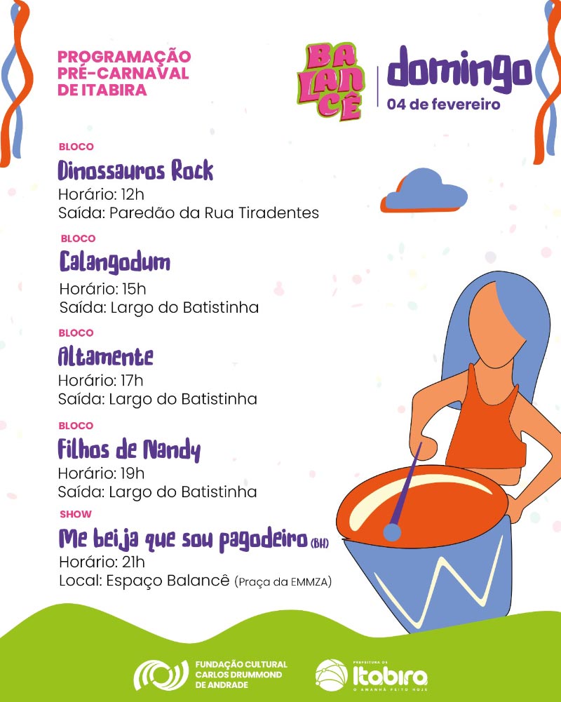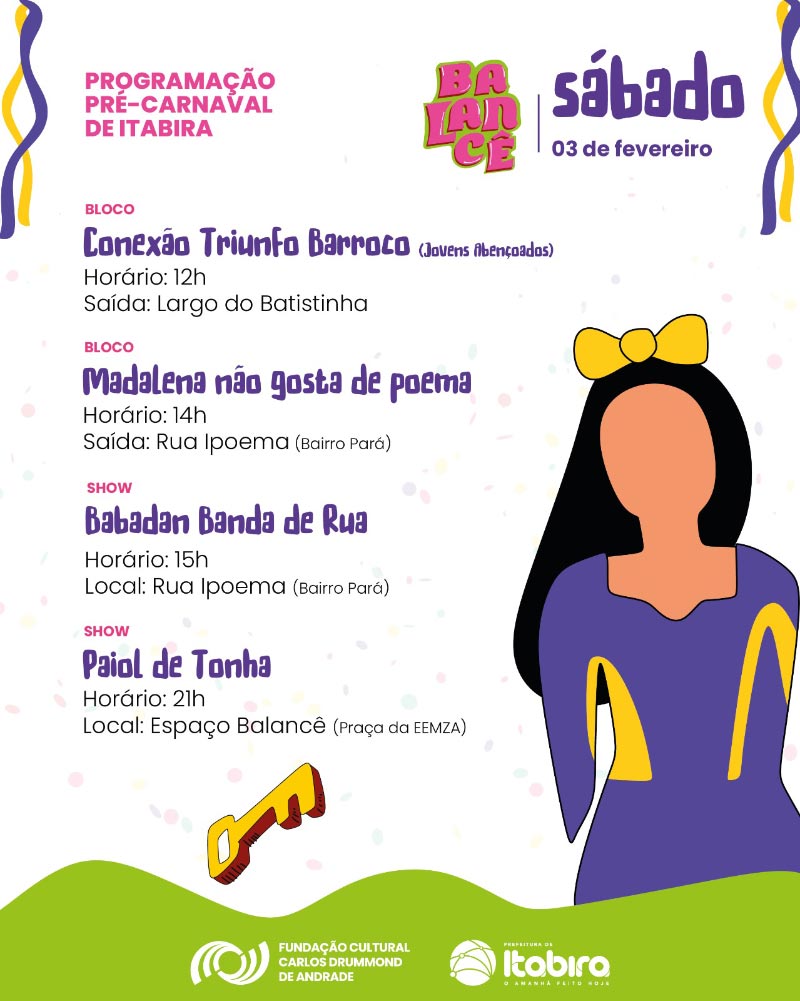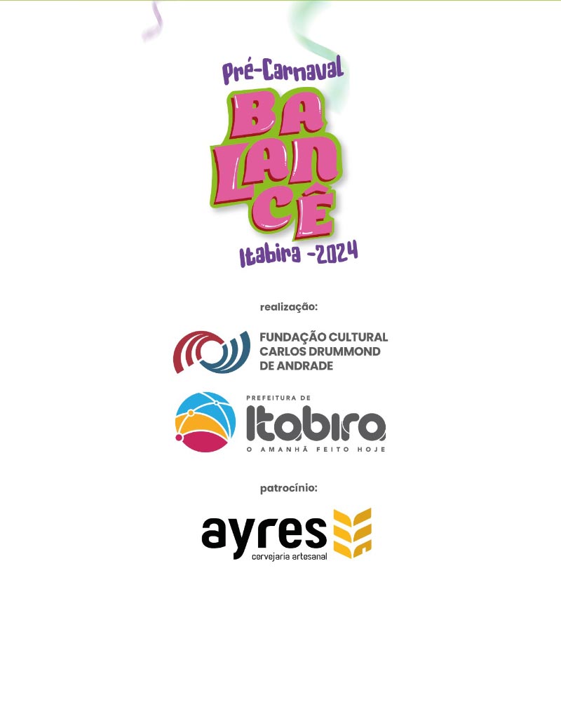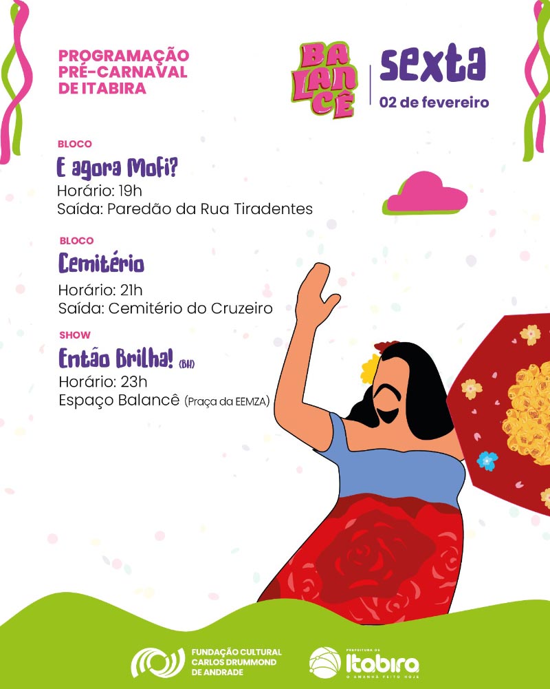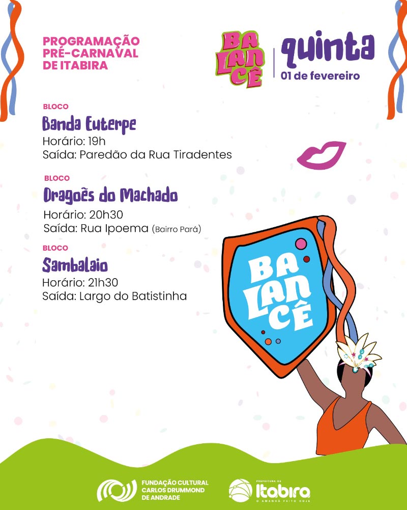 O esquenta para a festa mais plural e democrática do país, na cidade de Carlos Drummond de Andrade, terá como tema o clássico de Gal Costa “Balancê” sendo um tributo à cantora. O evento é uma realização da Prefeitura de Itabira e Fundação Cultural Carlos Drummond de Andrade (FCCDA).