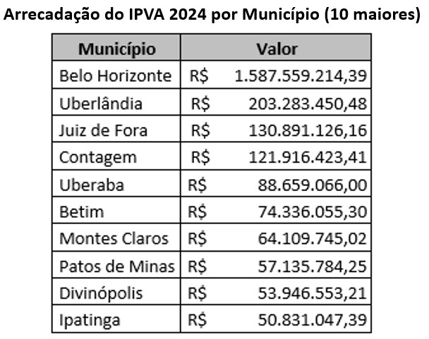A Superintendência de Arrecadação e Informações Fiscais da Secretaria de Estado de Fazenda de Minas Gerais (SEF-MG) divulgou, nesta quinta-feira (8/2), o balanço parcial do IPVA pago em 2024.