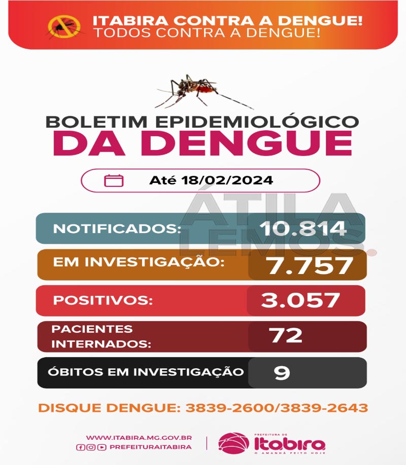 Unindo forças e contribuindo com a fiscalização, o Controle de Endemias de Itabira orienta para as denúncias em relação ao descarte de lixo em terrenos baldios ou demais situações que culminam em criadouros para o mosquito da dengue. Todas as situações relacionadas devem ser relatadas através do telefone 31 3839-2600 e 3839-2643.