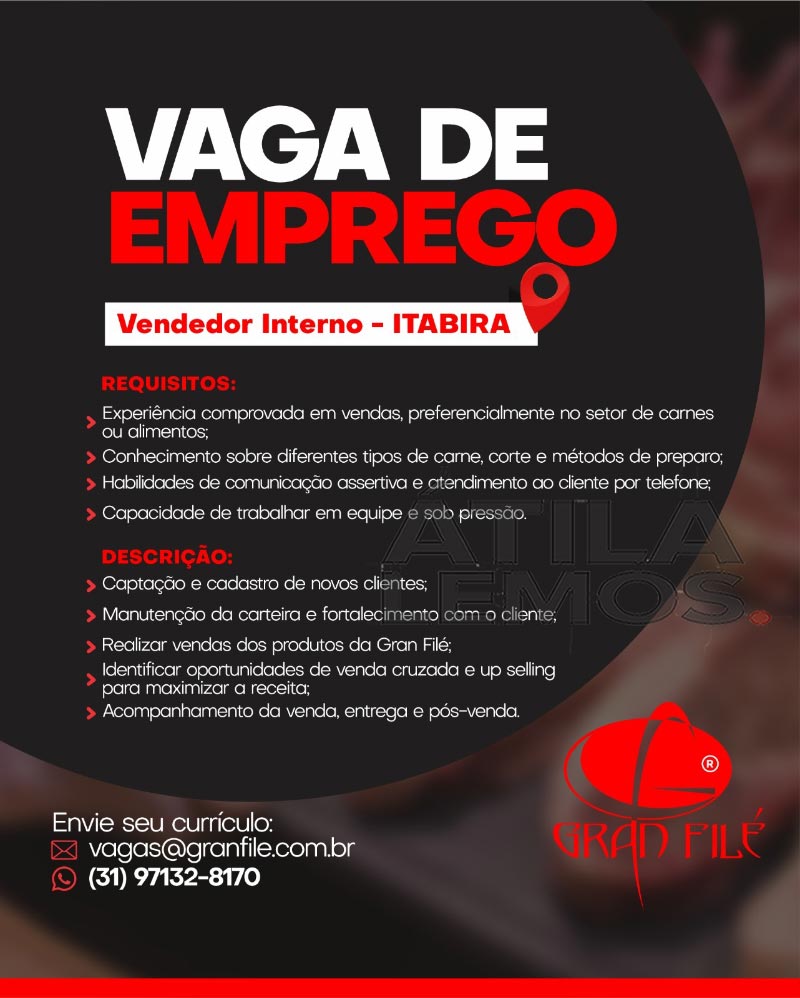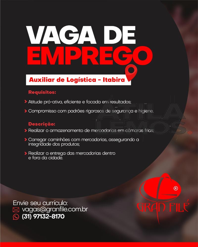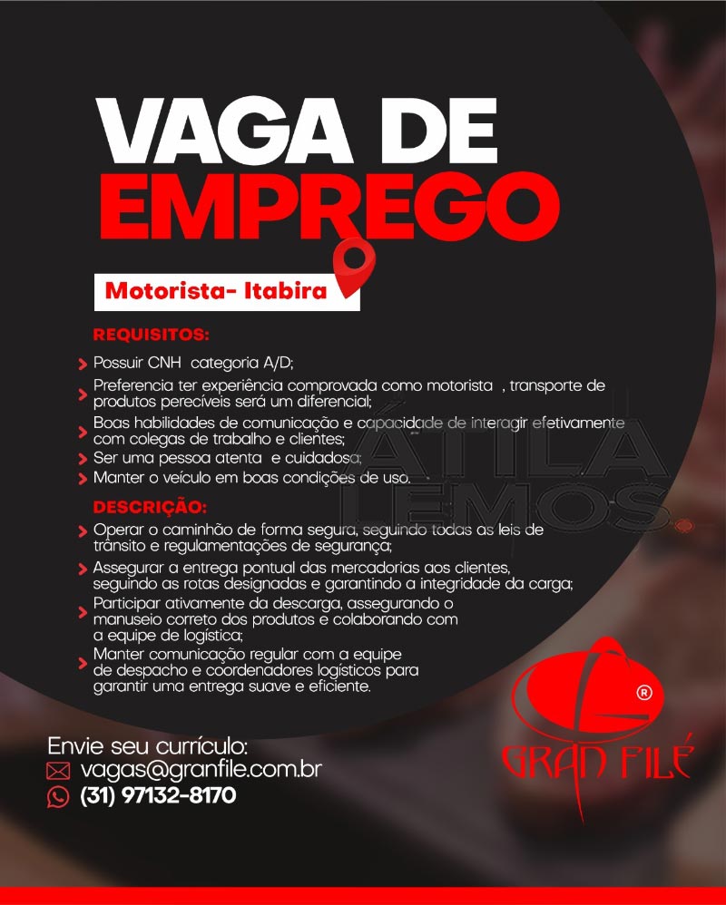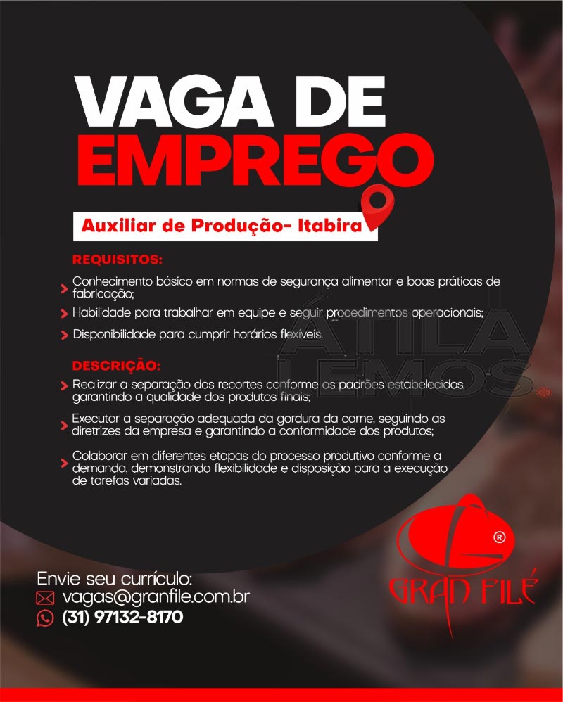 As pessoas interessadas na divulgação, deverão encaminhar os dados da vaga para o e-mail descrito em cada uma. Nosso portal apena divulga as vagas, cabe a você entrar em contato com quem está ofertando via e-mail ou aplicativo. Os interessados que tenham perfil dessa vaga, deverão enviar o currículo à empresa Gran Filé no e-mail: vagas@granfile.com.br com o nome da vaga no assunto.