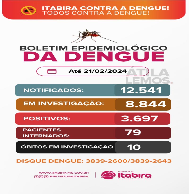 Unindo forças e contribuindo com a fiscalização, o Controle de Endemias de Itabira orienta para as denúncias em relação ao descarte de lixo em terrenos baldios ou demais situações que culminam em criadouros para o mosquito da dengue. Todas as situações relacionadas devem ser relatadas através do telefone 31 3839-2600 e 3839-2643.