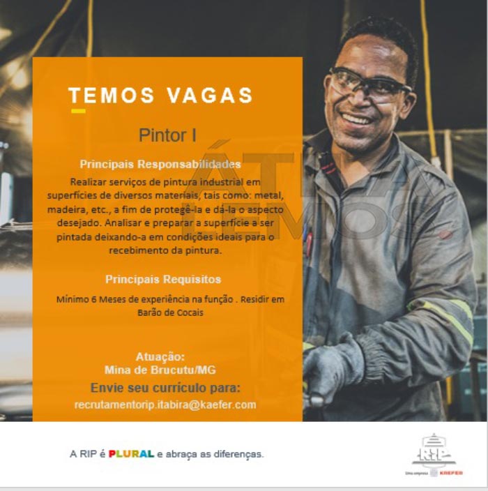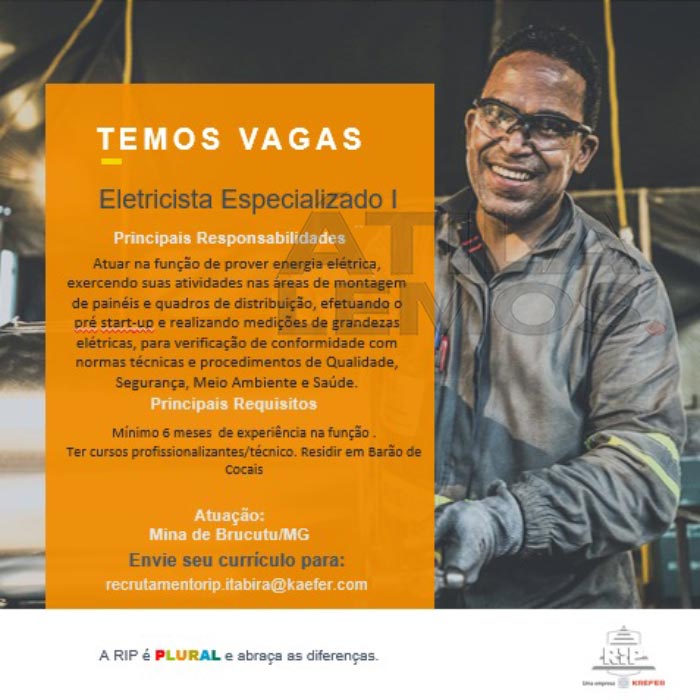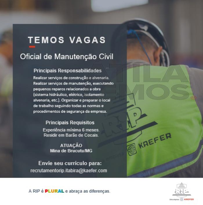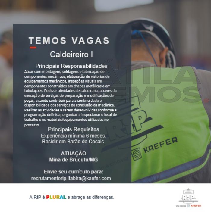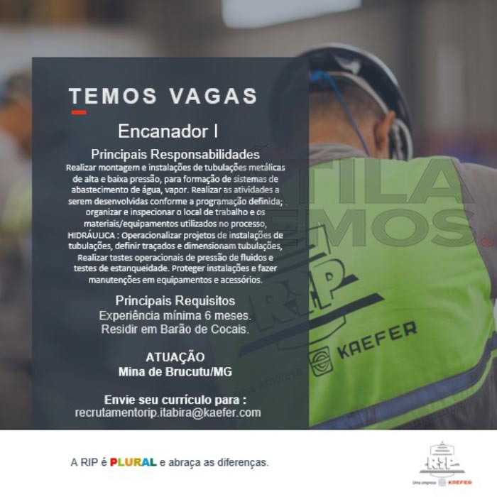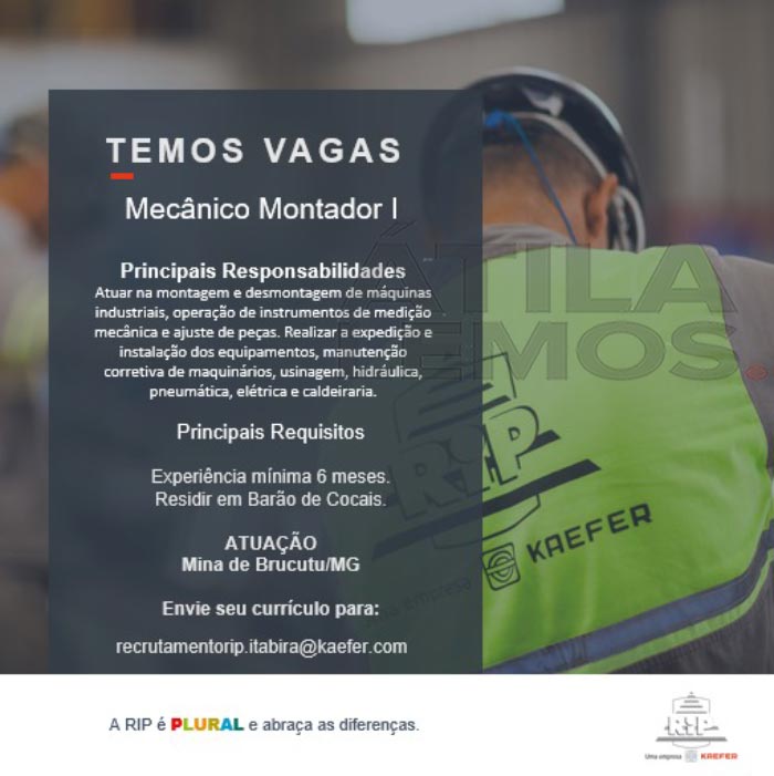 Fundada em 1986, a RIP fornece serviços integrados especializados para diversos segmentos industriais, entre eles, Revestimentos Refratários, Isolamento Térmico, Proteção Anticorrosiva, Proteção Passiva, Acessos, Manutenção Eletromecânica, Manutenção Civil, Facilities, Operação e Manutenção em Ativos de Energia, além de serviços Offshore, como manutenções, acabamento de interiores, operação de guindastes e movimentação de cargas. As pessoas interessadas na divulgação, deverão encaminhar o currículo para e-mail: recrutamentorip.itabira@kaefer.com