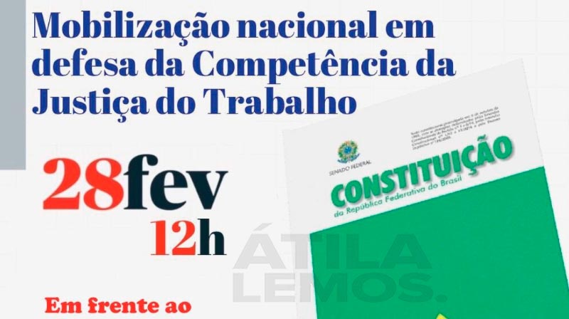 A OAB/MG, a OAB Itabira por meio da Comissão de Direito do Trabalho e a AMAT convocam a advocacia itabirana, estagiários(as), estudantes de Direito, serventuários da justiça e a sociedade civil para a Mobilização Nacional em Defesa da Competência da Justiça do Trabalho. O evento ocorrerá na próxima quarta-feira, dia 28 de fevereiro, às 11h30, em frente ao Fórum Trabalhista (Av. Pref. Li Guerra, nº 250, Bairro Praia).
