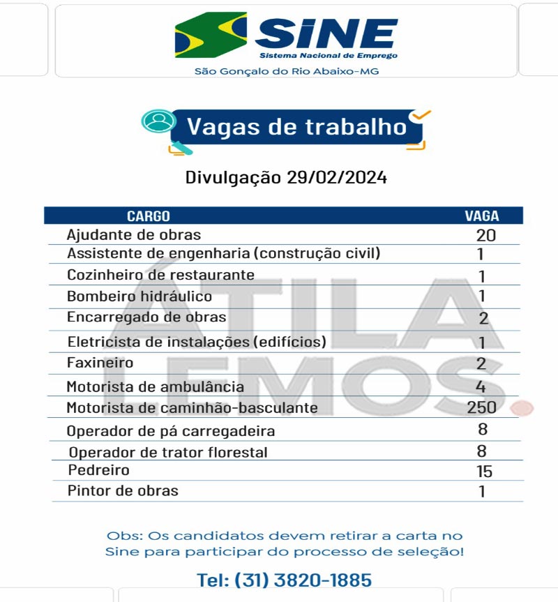 O SINE de São Gonçalo do Rio Abaixo está ofertando 314 VAGAS de emprego; somente para motoristas são 250 vagas.